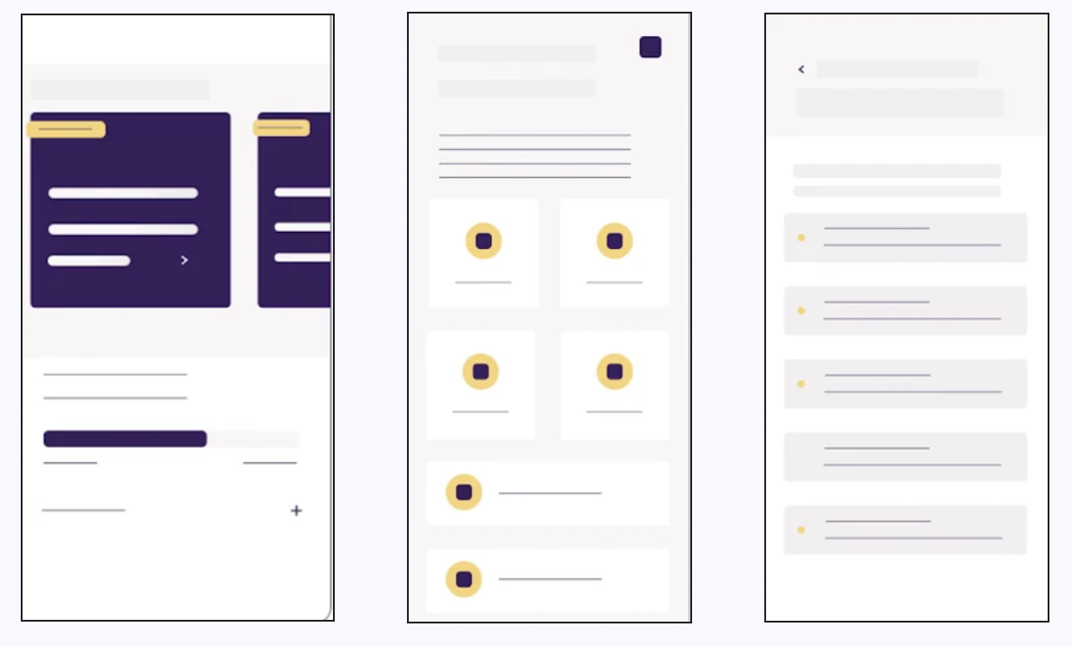 The updated color palette contained neutral colors such as light gray and white. These were the primary colors of the interface to avoid drawing focus from textual content. Purple and yellow accent colors were also added to give a playful, but at the same time a serious impression.
